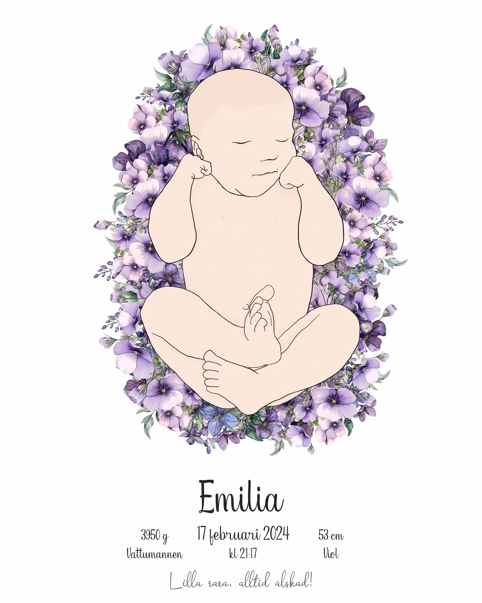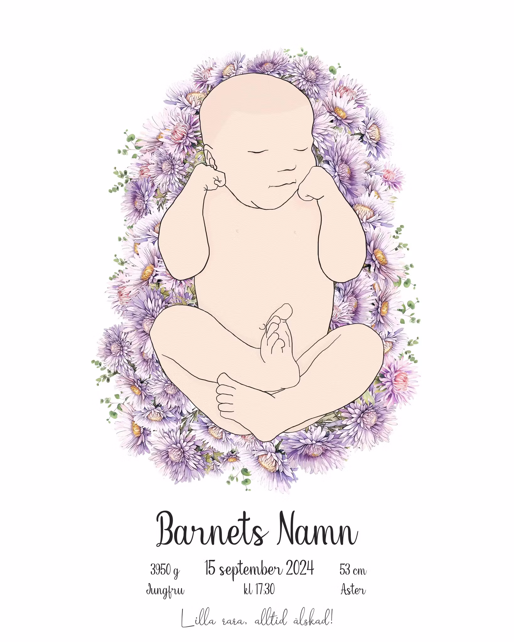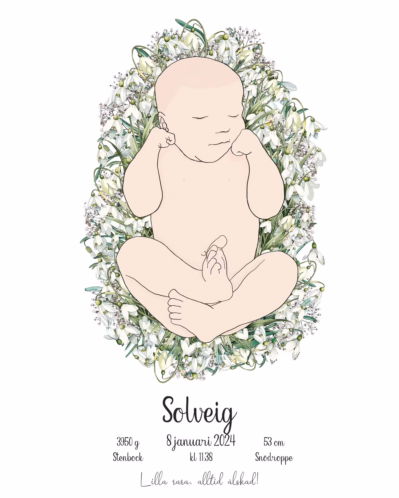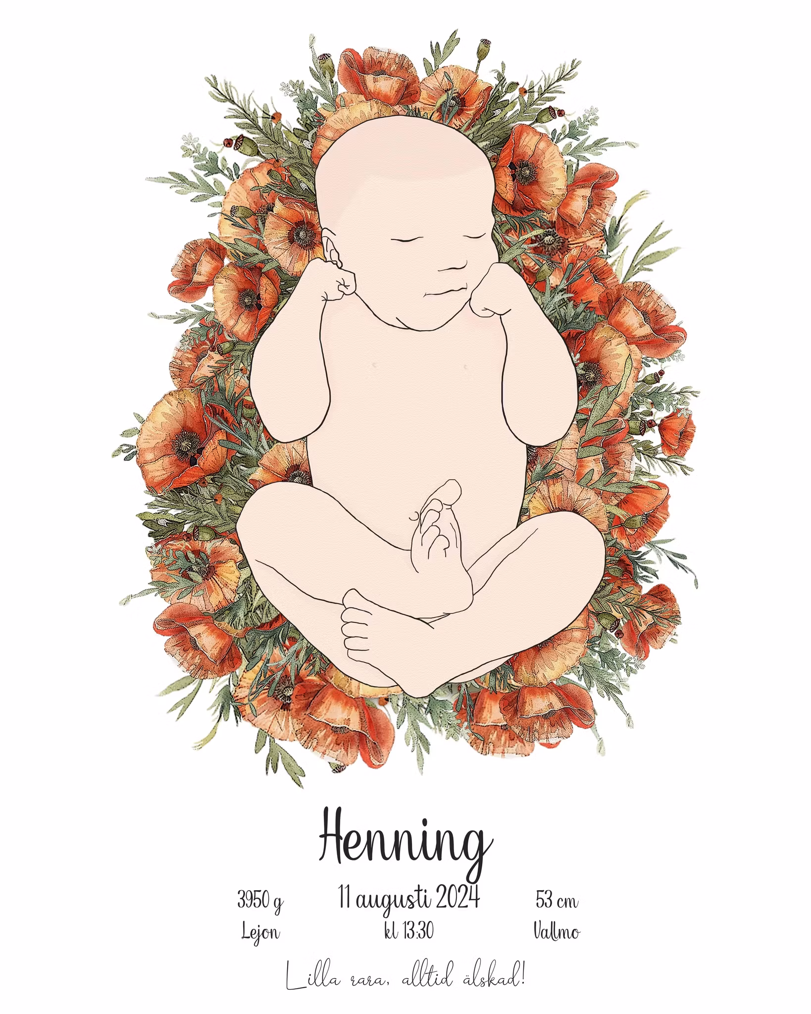 Denna födelsetavla är handritad med omsorg och kärlek. Varje poster är unik och skalenlig, anpassad efter ditt barns födelselängd, vikt, datum, tid, stjärntecken och månadsblomma – detaljer som gör tavlan till en personlig hyllning av det största i livet. Med mjuka färger och varma toner skapas en konstnärlig känsla som inte bara berättar din bebis historia utan även ger ditt hem en varm, kärleksfull atmosfär.