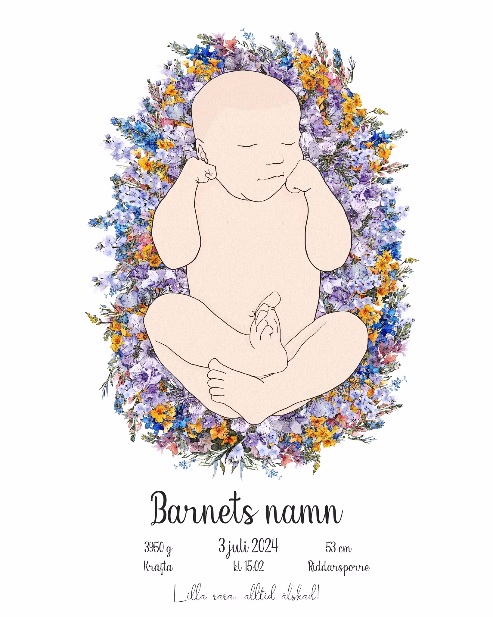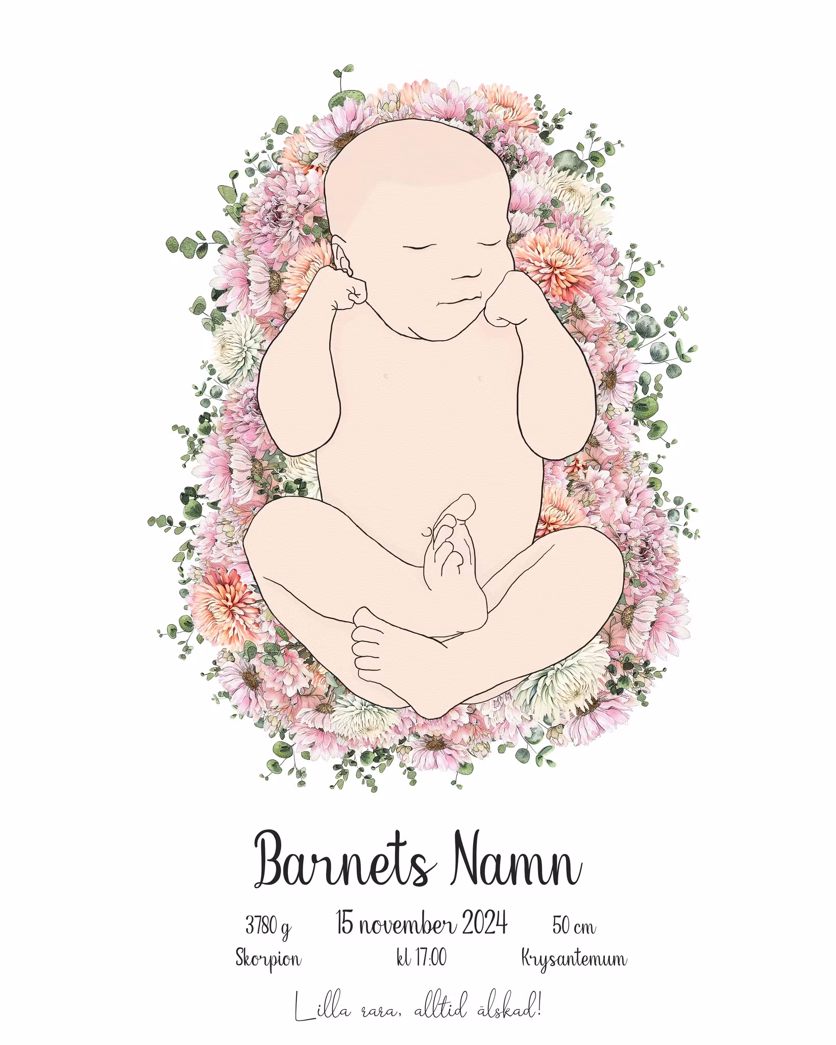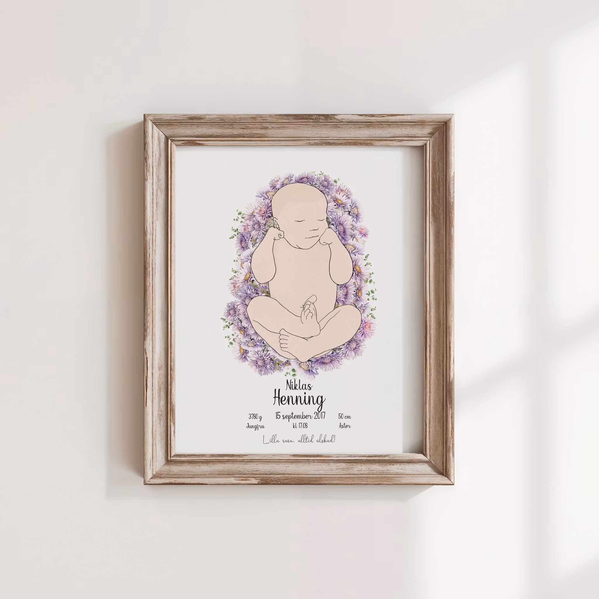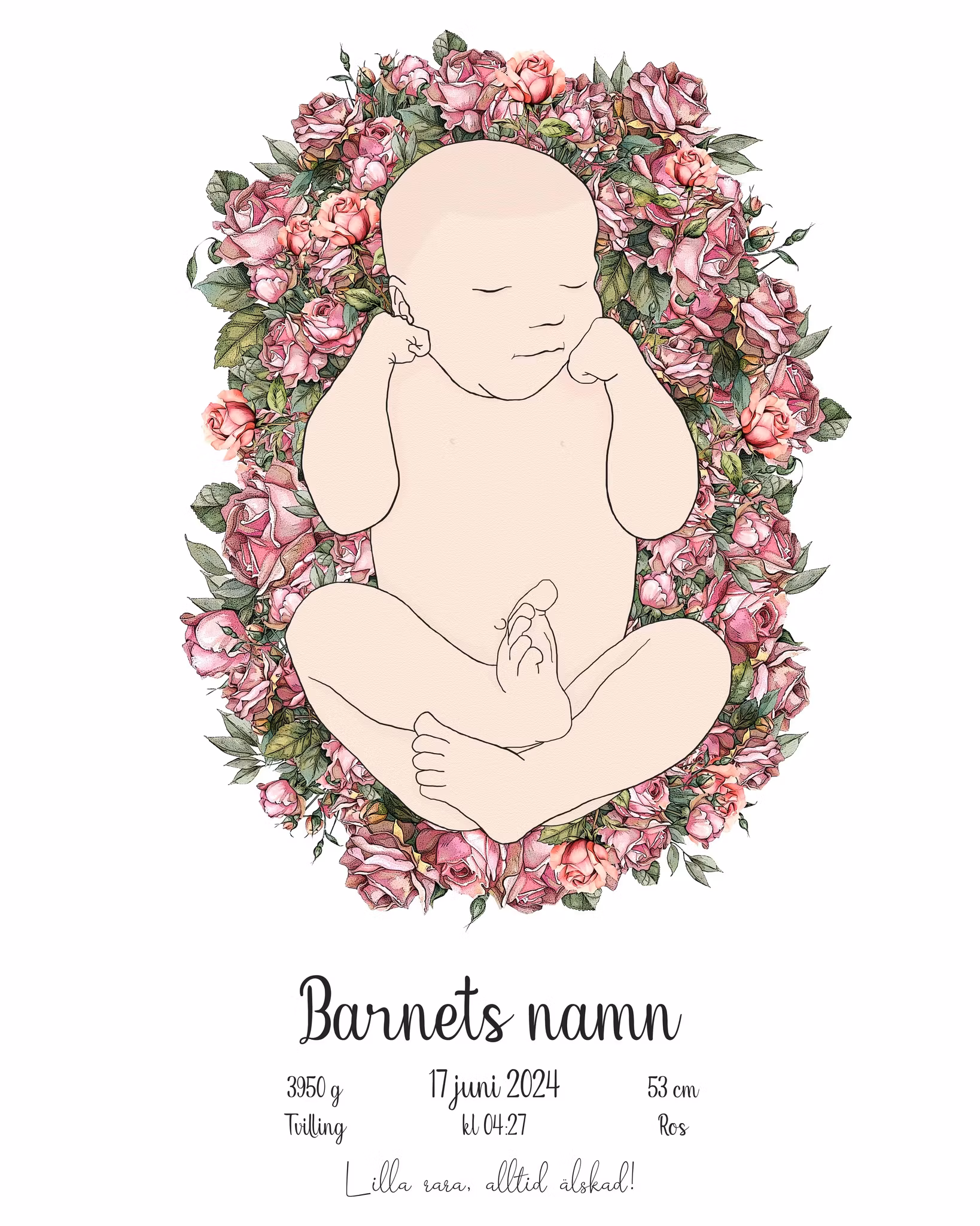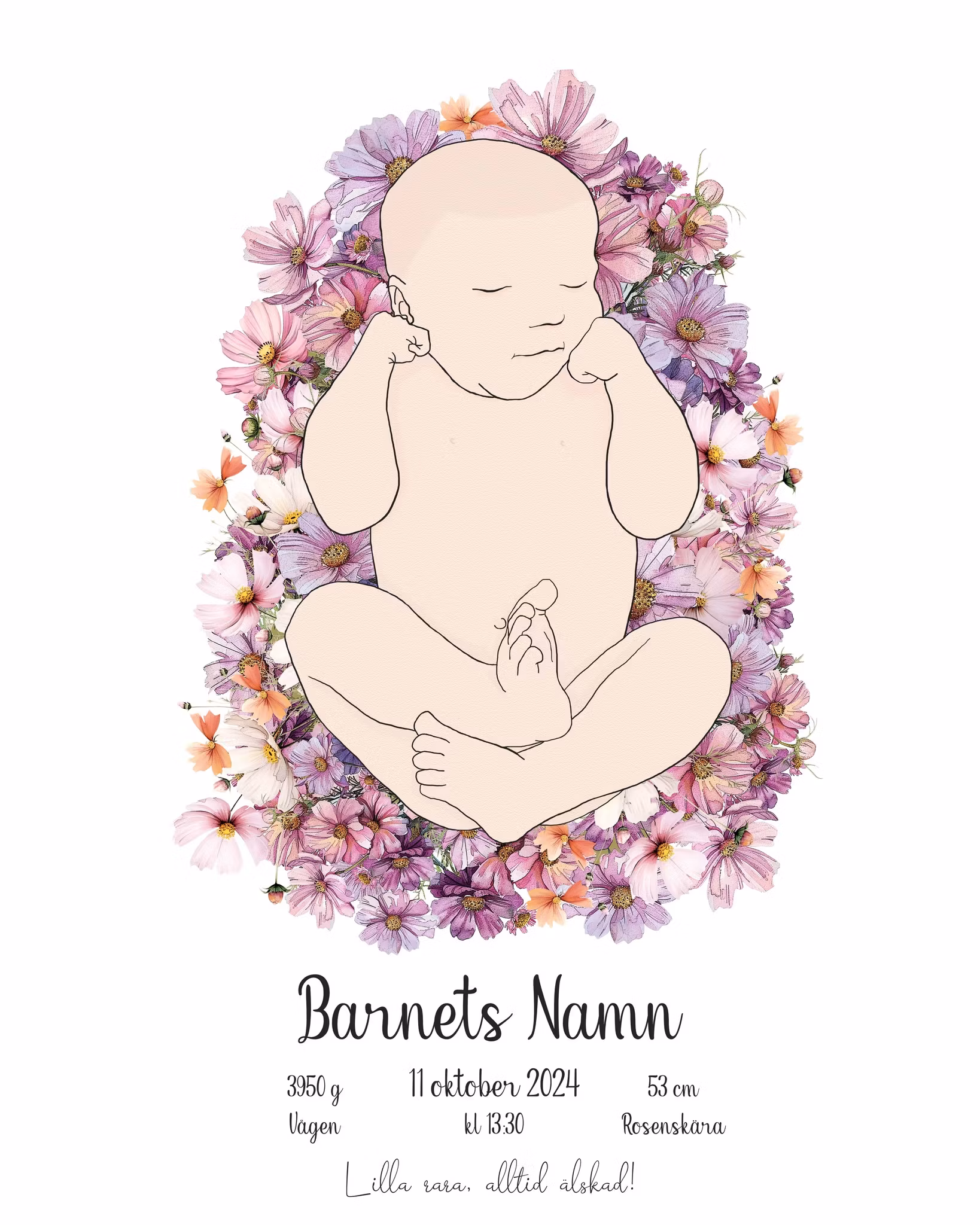 Denna födelsetavla är handritad med omsorg och kärlek. Varje poster är unik och skalenlig, anpassad efter ditt barns födelselängd, vikt, datum, tid, stjärntecken och månadsblomma – detaljer som gör tavlan till en personlig hyllning av det största i livet. Med mjuka färger och varma toner skapas en konstnärlig känsla som inte bara berättar din bebis historia utan även ger ditt hem en varm, kärleksfull atmosfär.