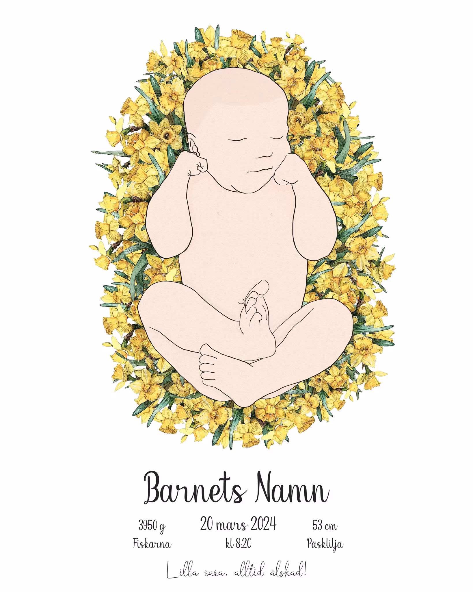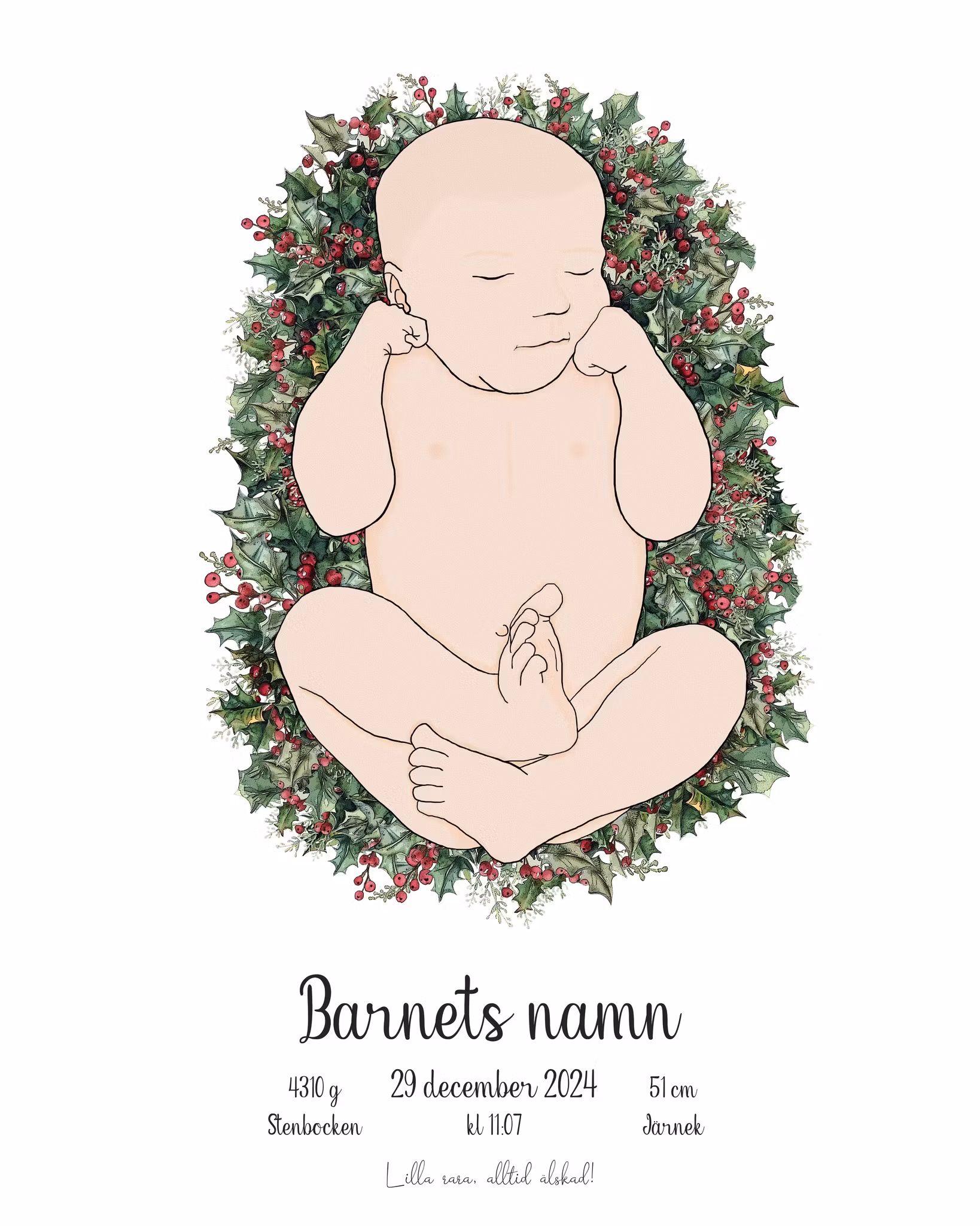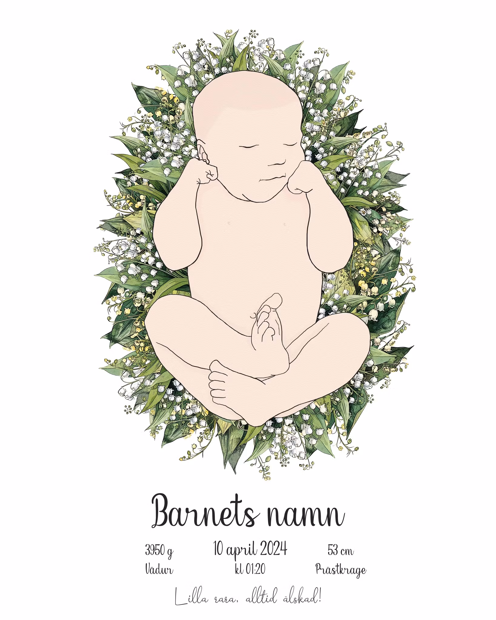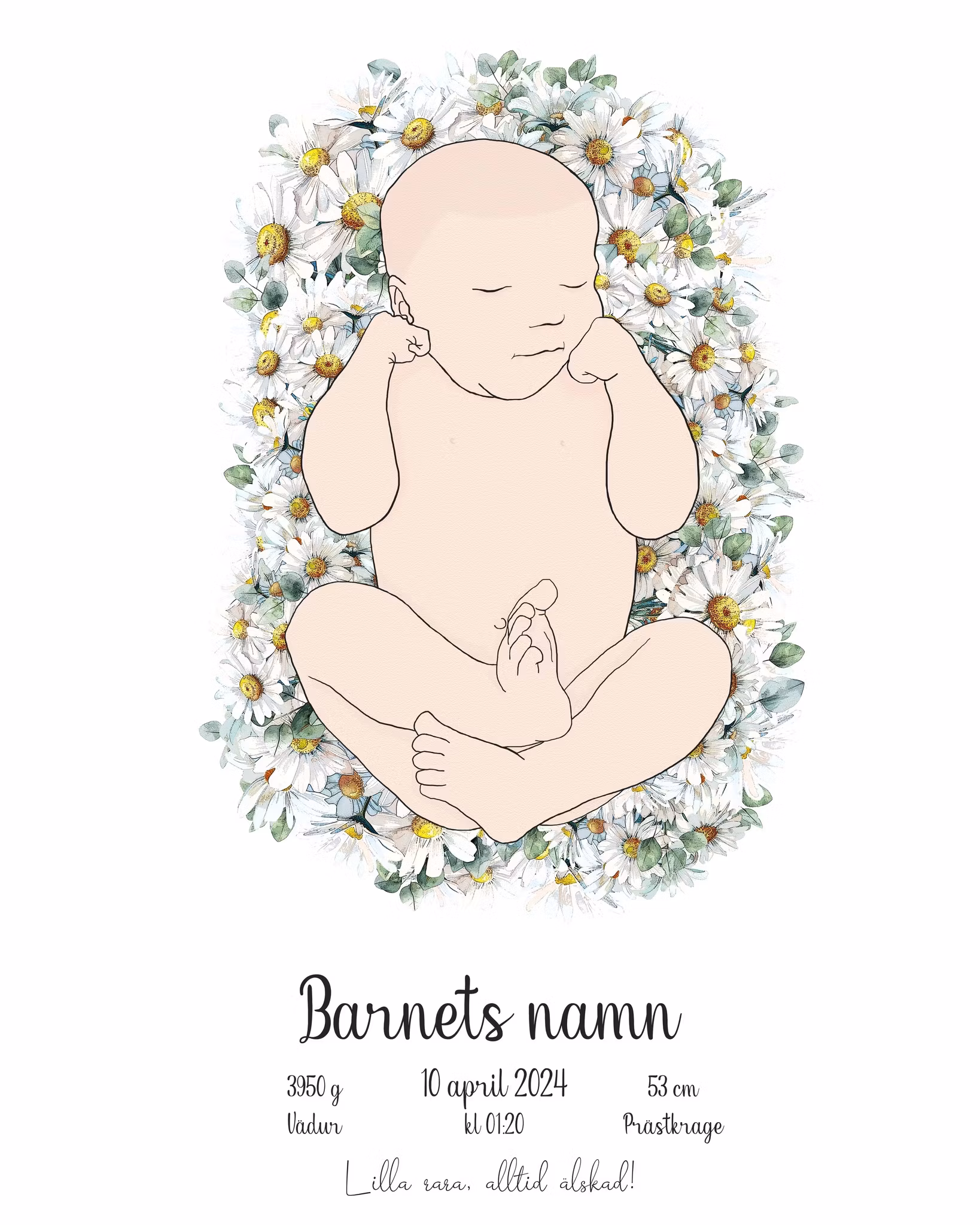 Denna födelsetavla är handritad med omsorg och kärlek. Varje poster är unik och skalenlig, anpassad efter ditt barns födelselängd, vikt, datum, tid, stjärntecken och månadsblomma – detaljer som gör tavlan till en personlig hyllning av det största i livet. Med mjuka färger och varma toner skapas en konstnärlig känsla som inte bara berättar din bebis historia utan även ger ditt hem en varm, kärleksfull atmosfär.